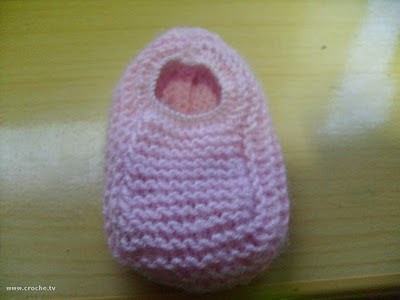 Fazer logo após as 18 carreiras mais uma carreira em cordão de tricô e arrematar com uma agulha de crochê colocando latéx ou lastéx no sapatinho arrematando os pontos com este elástico como mostro no vídeo. Também mostro como arrematar com agulhas de tricô.