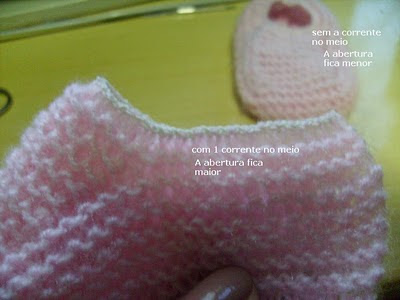 2 -Você pode fazer sem a correntinha, somente pontos baixíssimos, como está nas fotos, veja a diferença. Uma fica mais larguinha e a outra fica mais fechada.Vai depender da grossura do tornozelo do babê.