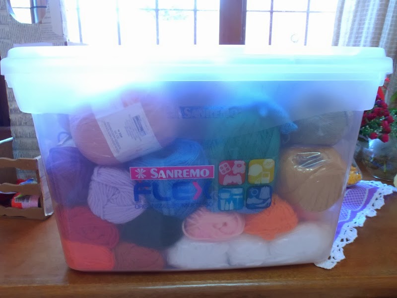 Hoje estava dobrando roupas aqui em casa sabe, colocando algumas coisas no lugar, e o pote que havia falado no post anterior é este aí, enoorme por sinal, tem muito novelos usados e inteiros ainda, tem Anne, Camila, Bella, Mollet, Desejo…