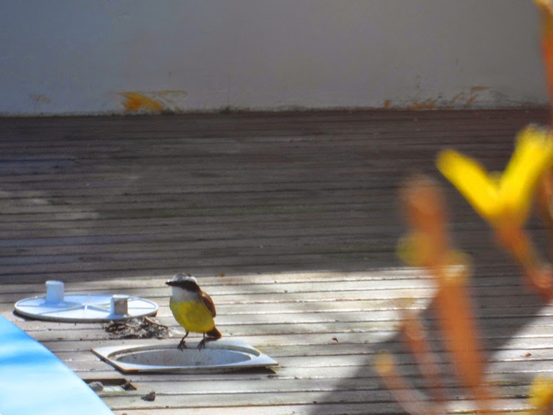 Hoje pela manhã teve sim um sol, aquele solzinho gostoso. Meu marido foi limpar o filtro da piscina e quando estávamos dentro de casa este pássaro bentivi ficou um tempão tentando pegar algo de dentro do filtro.