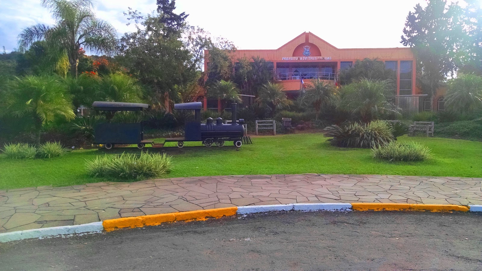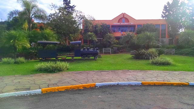 Me lembro que era um dia lindo e ensolarado. Meu marido queria me mostrar as cidades pequenas vizinhas de Gramado. Eu estou sempre pedindo para conhecer novas cidades, e neste dia ele mudou o caminho da volta de Gramado ao invés de vir pela rua central. Três Coroas é uma cidadezinha pequena e graciosa. Não dá para se despersar muito porque quando vimos já tinhamos passado por ela, srsrs Como podem ver a prefeitura tem este trenzinho. Quero levar minha filha pequena lá novamente para entrar no trenzinho, aí tiro outra foto para mostrar para vocês. Quando fomos ela era pequeninha ainda bebê.